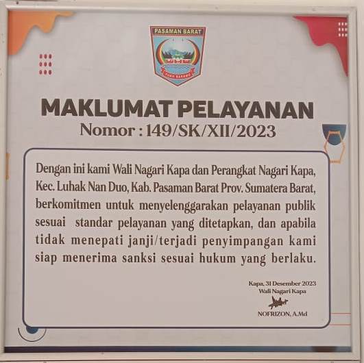 Maklumat Pelayanan Informasi Publik Wednesday, 12 July 2023 394 reads Nagari Kapa (Imawan) Photo: ppid.pasamanbaratkab.go.id